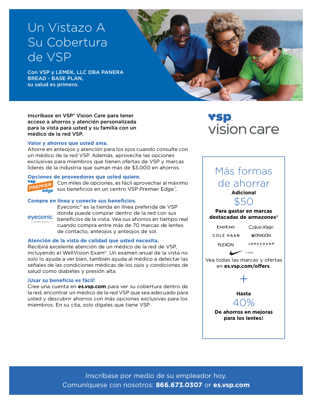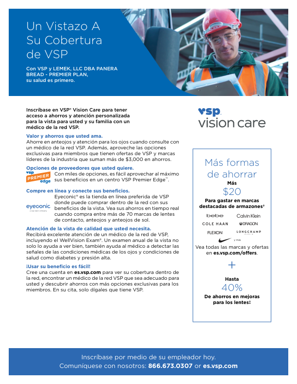Visita www.vsp.com o llamar 800-877-7195 y referencia Número de grupo: 12305389.
